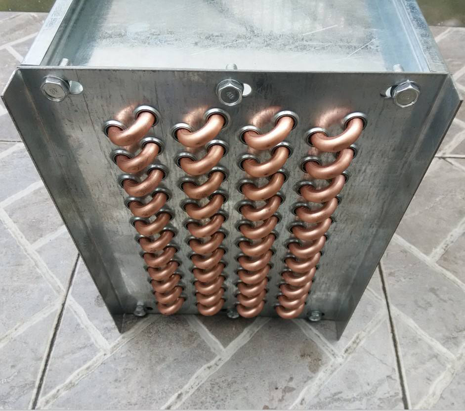 喷淋式蛇管换热器,此种换热器多用于冷却管内的热流体。固定在支架上的蛇管排列在同一垂直面上,热流体自下部的管进入,由上部的管流出。冷却水由管上方的喷淋装置中均匀地喷洒在上层蛇管上,并沿着管外表面淋沥而下,降至下层蛇管表面,最后收集在排管的底盘中。该装置通常放在室外空气流通处,冷却水在空气中气化时,可带走部分热量,以提高冷却效果。