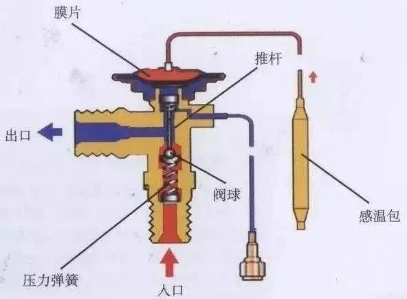 起节流降压的作用,经冷凝器冷凝后的高压制冷剂液体经过节流阀时,因受阻而使压力下降,导致部分制冷剂液体汽化,同时吸收气化潜热,其本身温度也相应降低,最为低温低压的湿蒸汽,然后进入蒸发器。