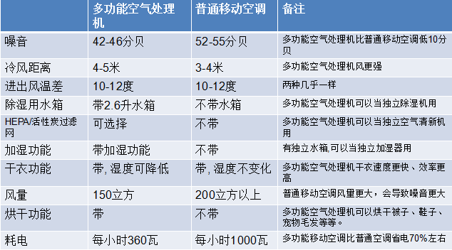 多功能空气处理机与普通移动空调对比: